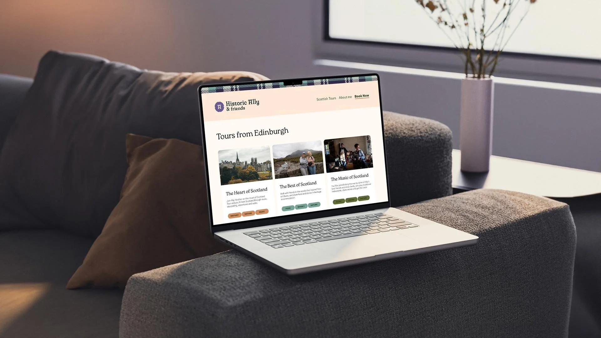 A restrained colour palette of soft, earthy tones was chosen to reflect Scotland’s landscape. This helps set expectations of warmth and credibility, while making the identity easy to apply consistently across print and digital as the tours expand.